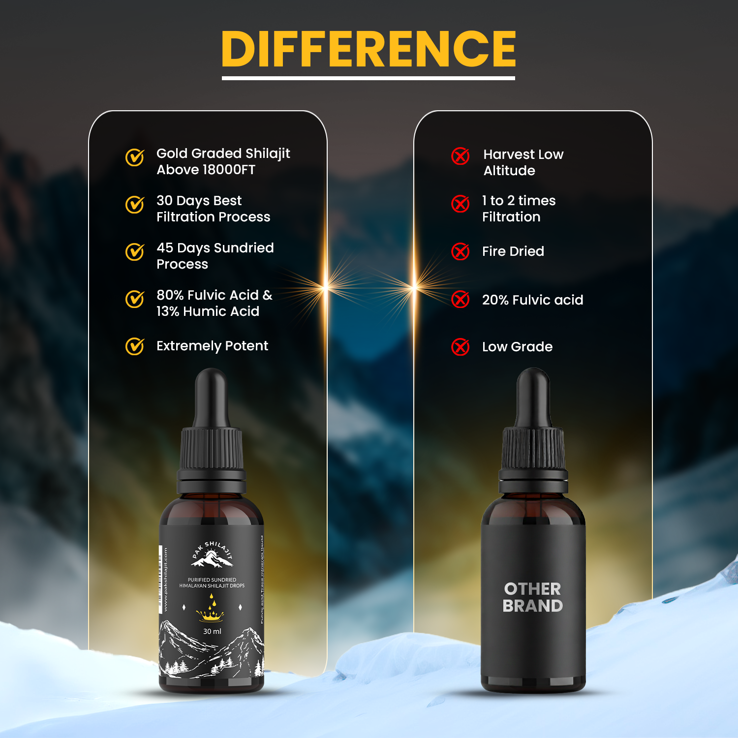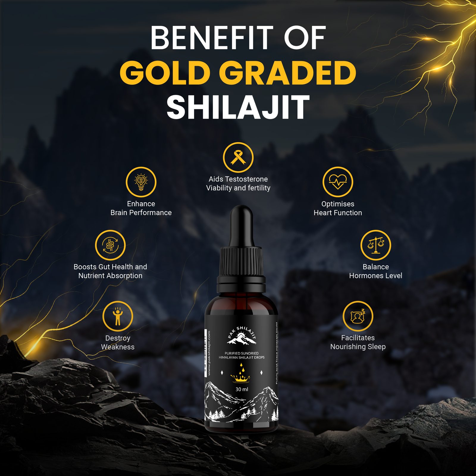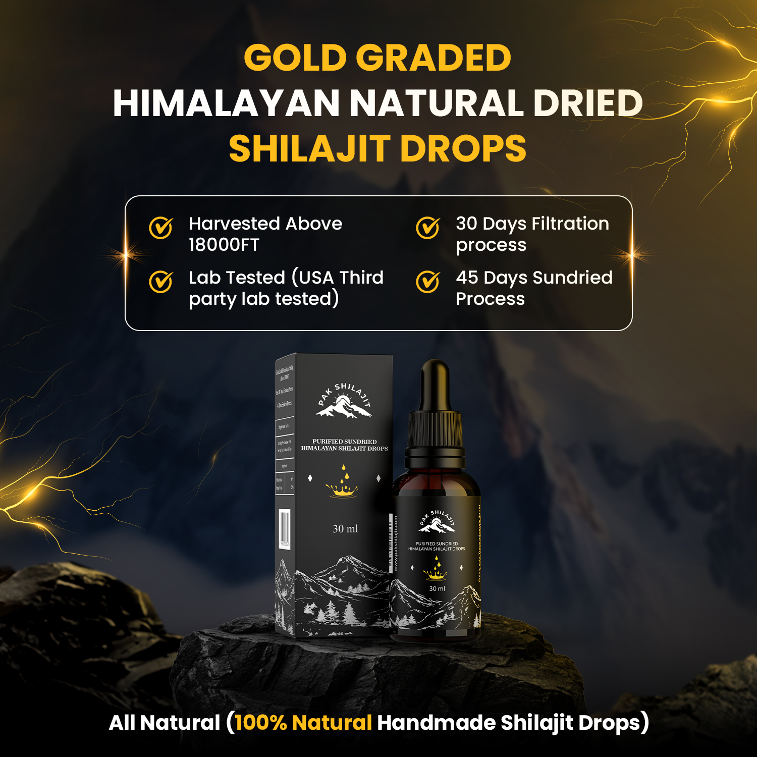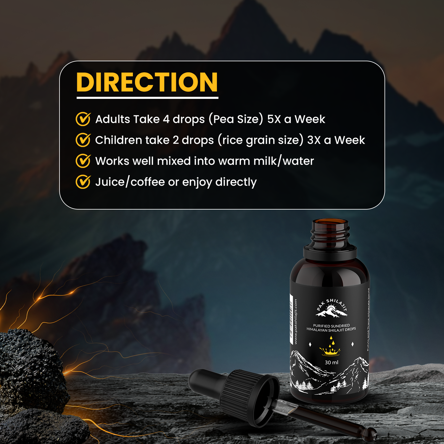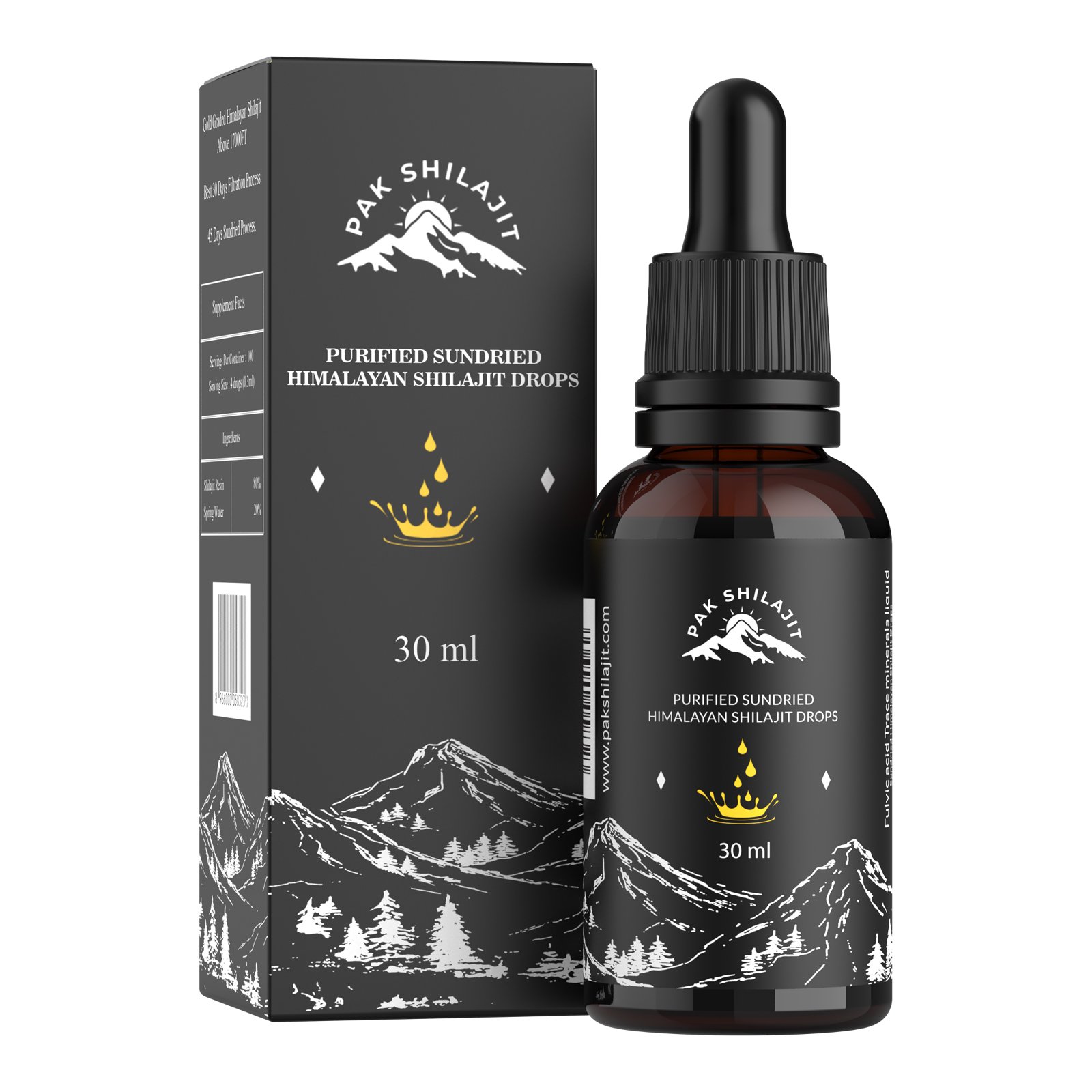 Most Premium Sundried Himalayan Shilajit Drops by PakShilajit. World’s only Sundried Himalayan Shilajit Drops Above 18000FT From Himalayan Mountains. USA Lab Tested Shilajit drops.