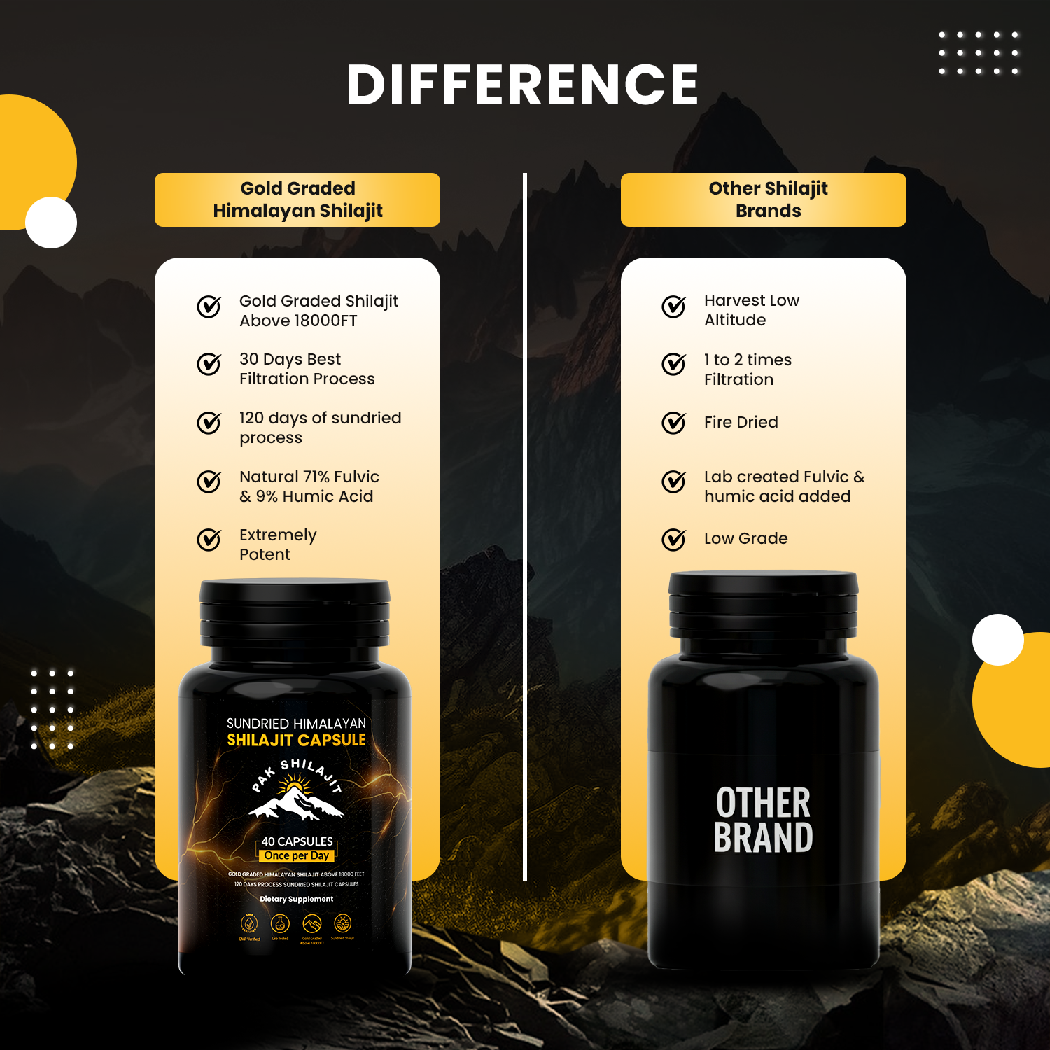 Our Shilajit is harvested from the exudates of rocks and undergoes a meticulous 45-day sun-drying process, followed by a 30-day filtration process to ensure maximum purity and potency. Unlike other brands that use fire drying, our sun-drying method preserves the natural potency of minerals and bioactive compounds, resulting in a superior product.