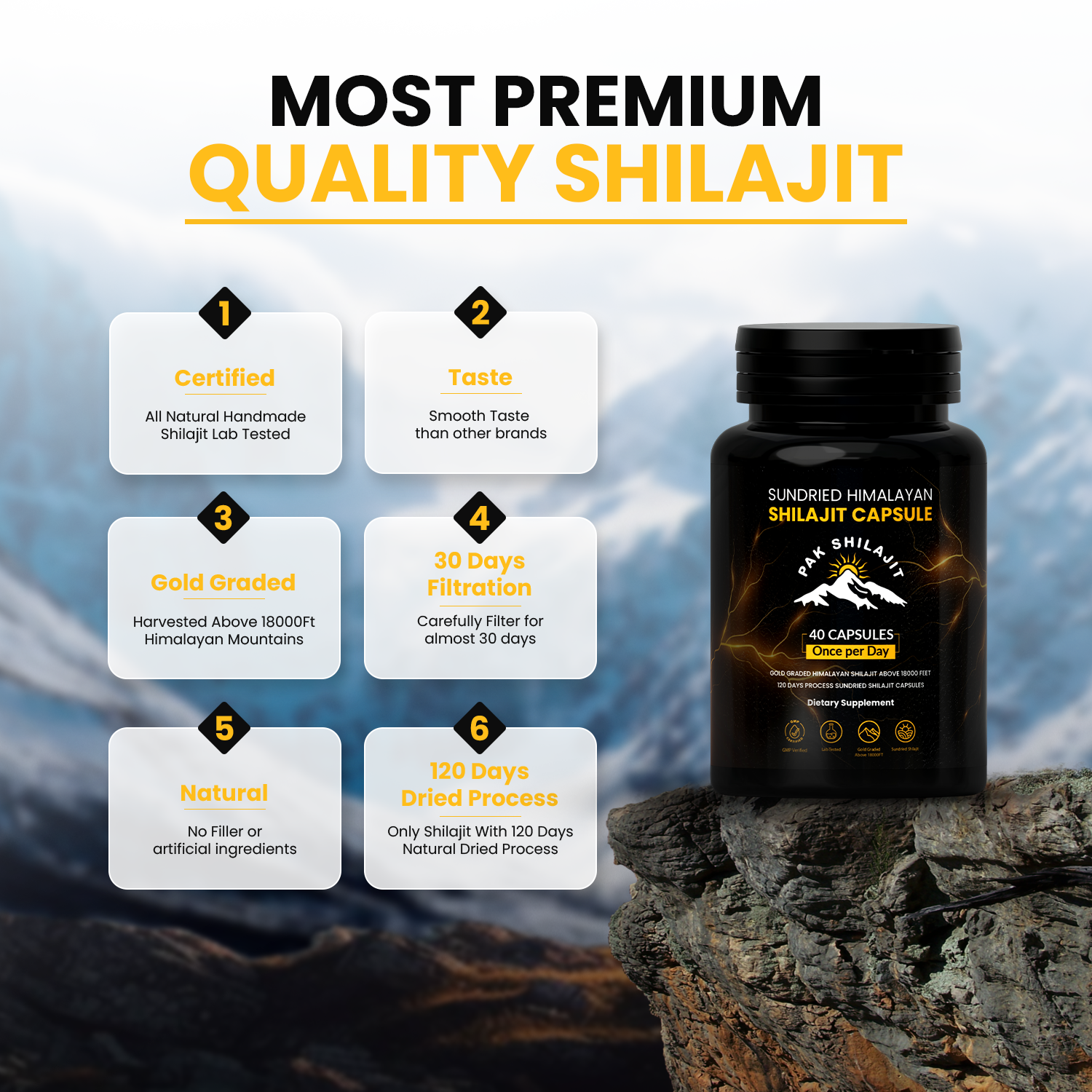 Most Premium Himalayan Sundried Shilajit Capsules. World First Himalayan Sundried shilajit capsules. Gold Graded and Sundried Shilajit Capsules.